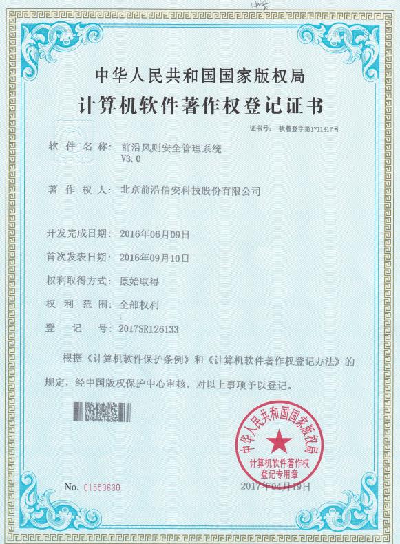北京软件和信息服务业协会”软件产品证书 “--前沿风雷V6.0