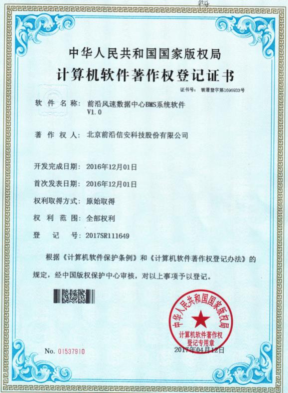 软件著作权证书--前沿风速数据中心BMS系统软件V1.0